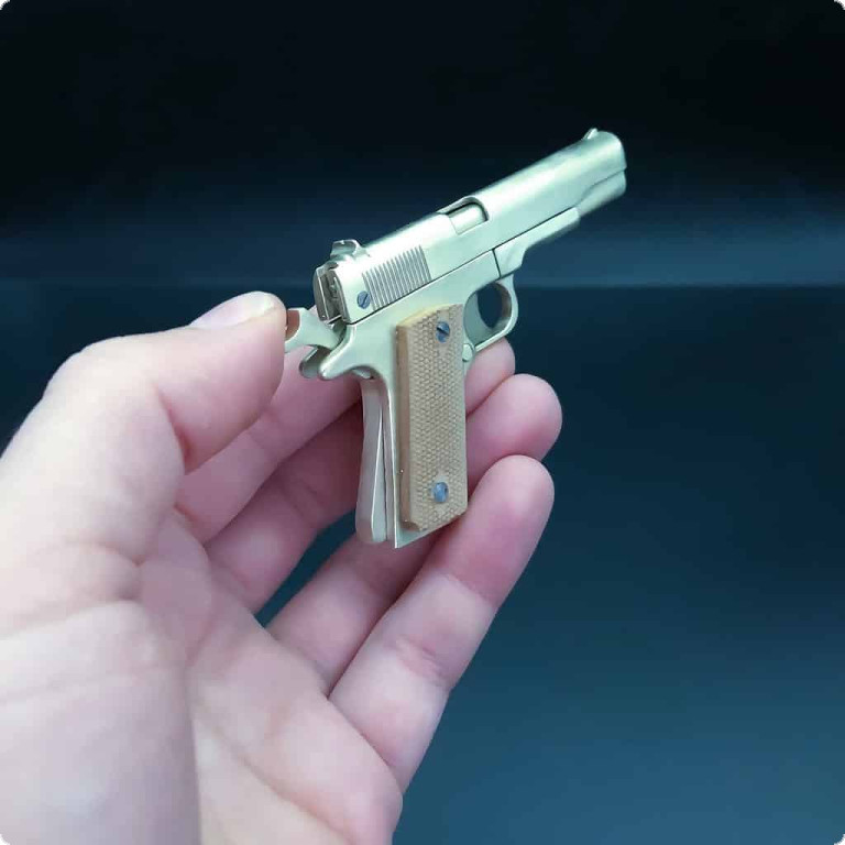 Цілком металевий мініатюрний пістолет ручної роботи з кастомізованими дерев’яними накладками та акуратно вигравіруваним надписом на стволі. Модель обладнано муляжним магазином, що виймається, та частинами, що рухаються: курок зводиться і при натисканні на спусковий гачок робиться постріл.
