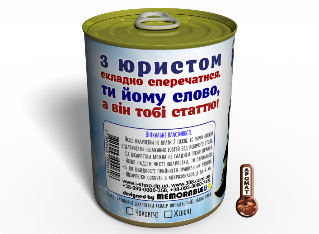 8 жовтня святкується День Юриста в Україні. І до цього дня ми приготували оригінальний подарунок для юриста - Де-юре Законсервовані Де-факто Шкарпетки. Такий подарунок напевно обрадує вашого юриста.
