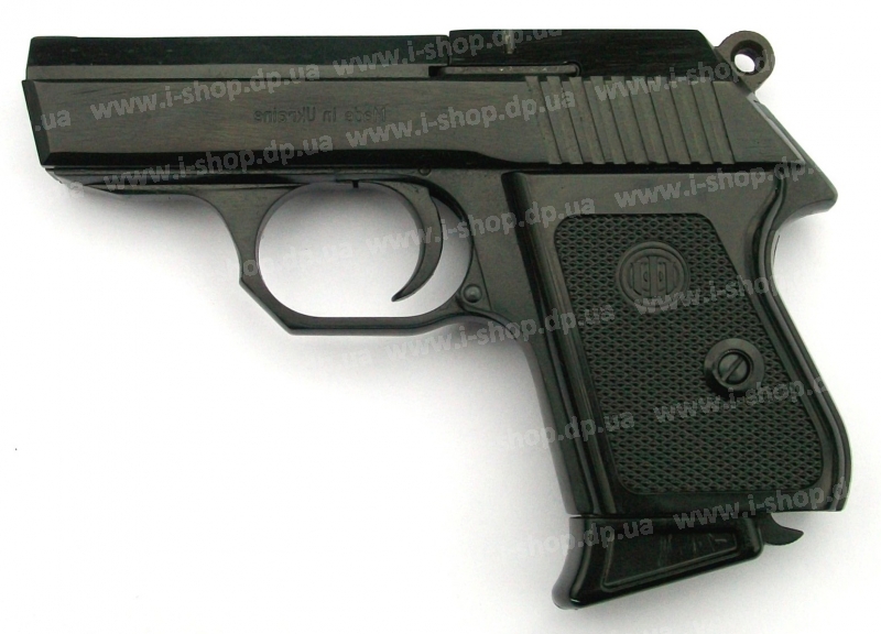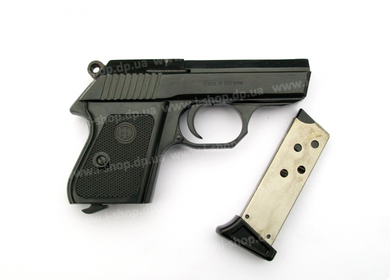 Отличный миниатюрный пистолет от компании Шмайсер (Украина). Стреляет газовыми и шумовыми патронами 8 мм. Таких патронов в обойму оружия помещается пять штук. Ствол пистолета изготовлен из стали 40Х и имеет гладкий ствол. Остальные детали оружия, преимущественно, изготовляются из сплава ЦАМ (цинк, алюминий, медь), хоть он и не такой прочный как оружейная сталь, но свои функции он выполняет отлично. Производитель гарантирует, что пистолет отстреляет до 5 000 патронов, а это более чем достаточно. Ударно спусковой механизм одинарного действия, а значит вести стрельбу можно только с предварительного взвода, но после первого выстрела пистолет взводится сам и можно произвести второй выстрел без перезарядки. На раме расположены открытые нерегулируемы прицельные приспособления. Размер пистолета достаточно маленький (135х24х95 мм), и его можно носить даже в кармане джинс. Корпус пистолета черного цвета. Поставляется в картонной коробке и комплектуется шомполом.
