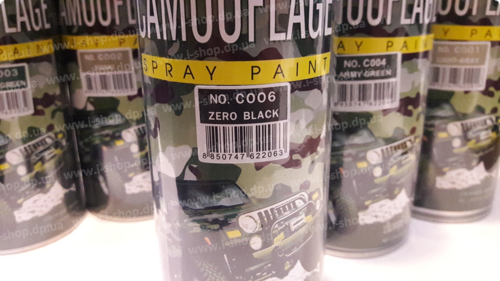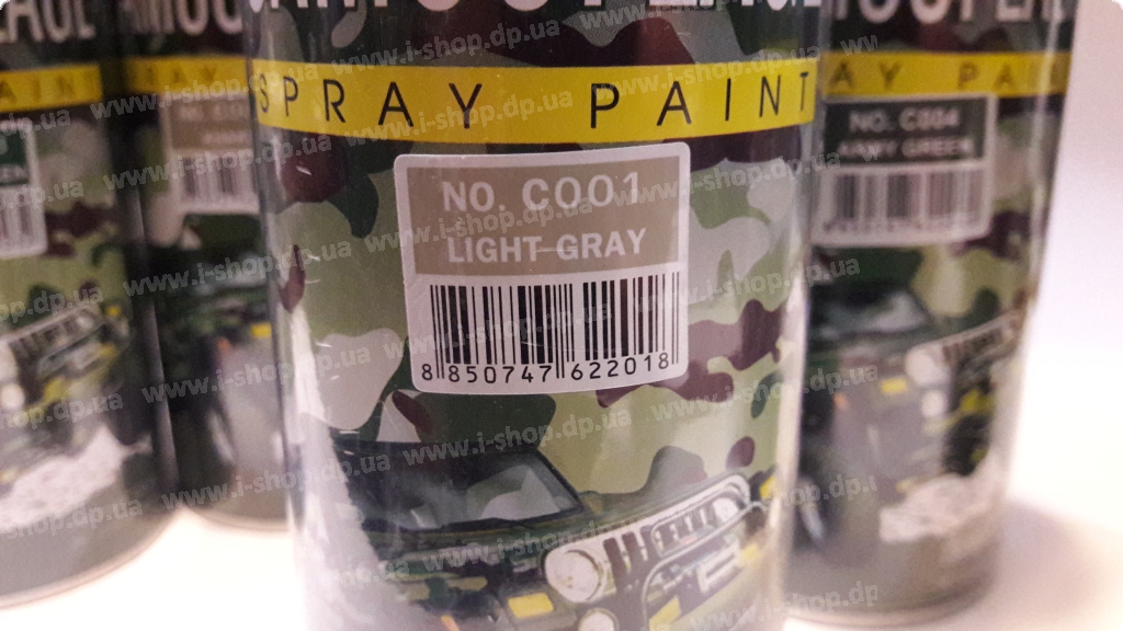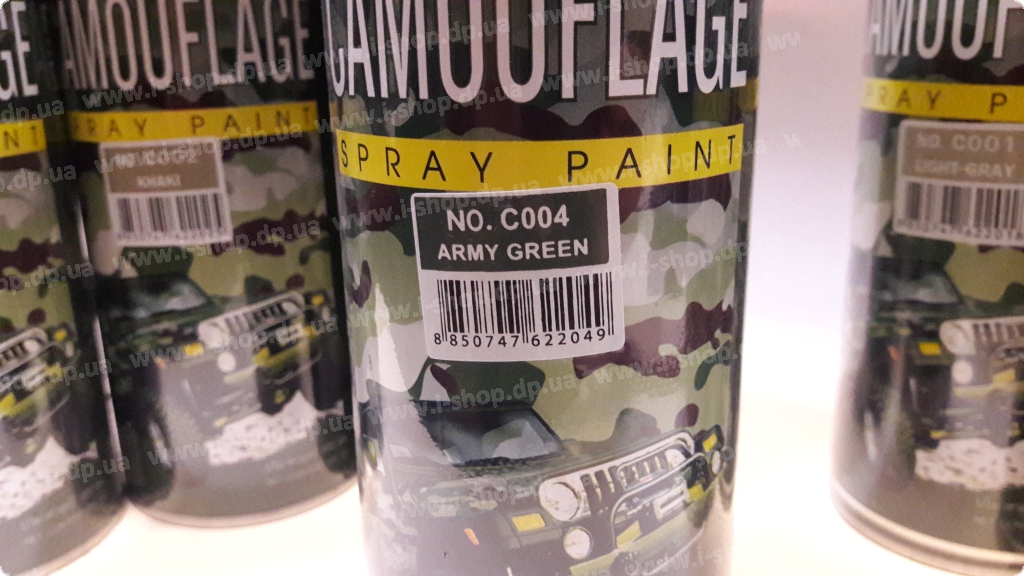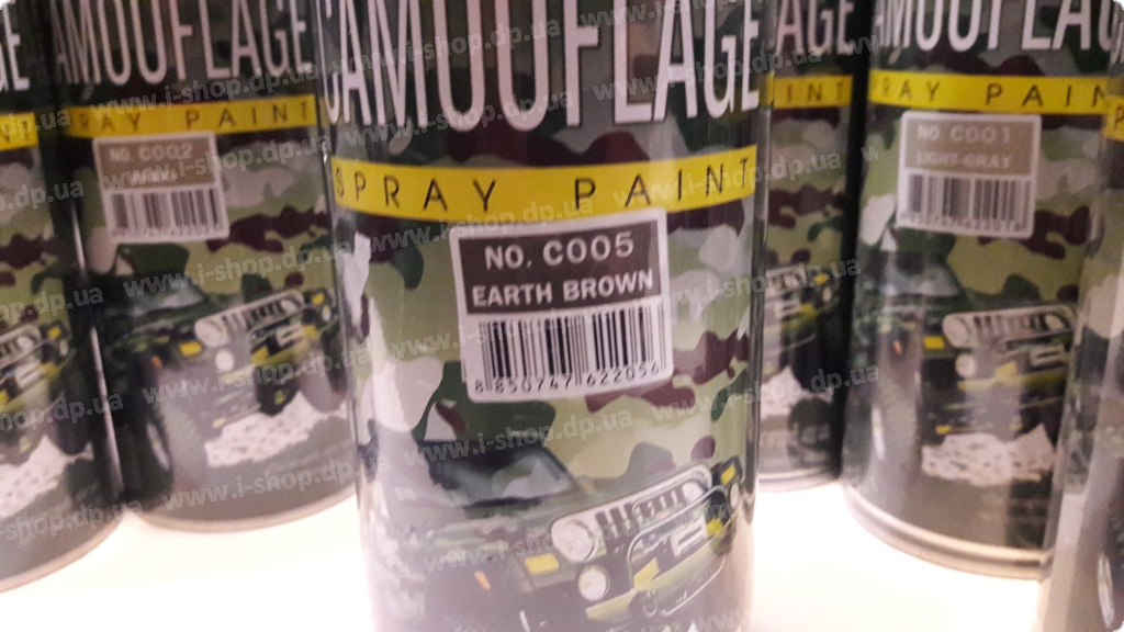 Серия «камуфляж» представлена комплектом из шести баллончиков спрей-краски различных цветов, объемом по 400 смі каждый. Среди них светло-серый C001, хаки C002, зеленый лес C003, армейский зеленый C004, земляной коричневый C005 и черный C006.