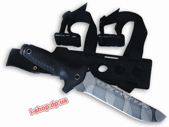 На клинке с камуфляжным покрытием расположена линейка для производства замеров. Прорезь в районе гарды служит для гибки и ломки проволоки. Металлическое навершие рукоятки используется для фиксации ножа в ножнах и в качестве молотка. Рукоятка ножа удобна для работы в водолазных перчатках. Камуфляжное покрытие клинка.