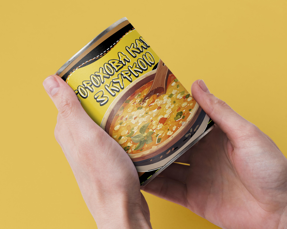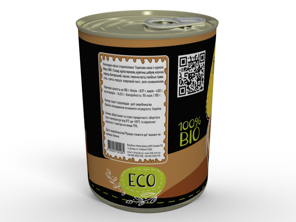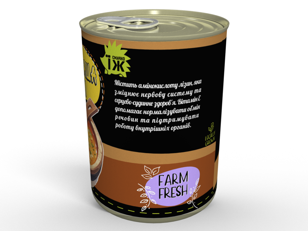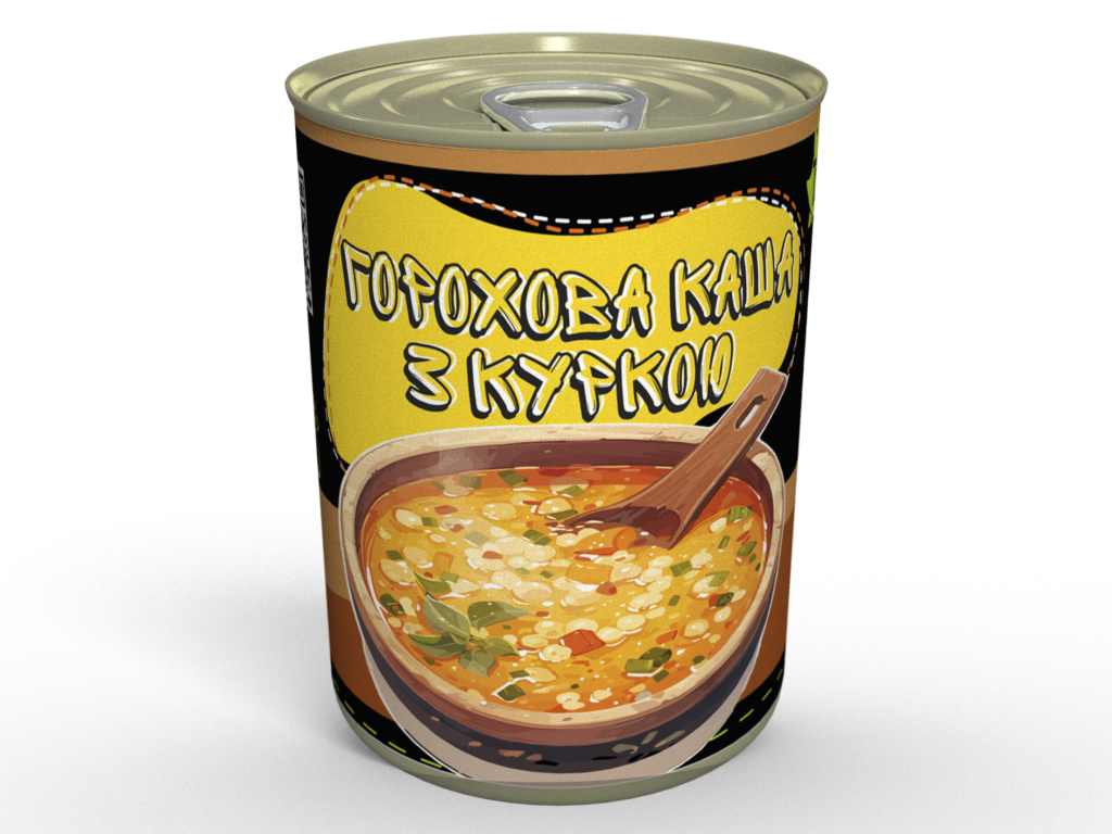 Склад: горохова крупа, курятина, білі гриби, цибуля, морква, перець болгарський, часник, томатна паста, італійські трави, сіль, суміш перців, лавровий лист, вершкова олія, соняшникова олія.