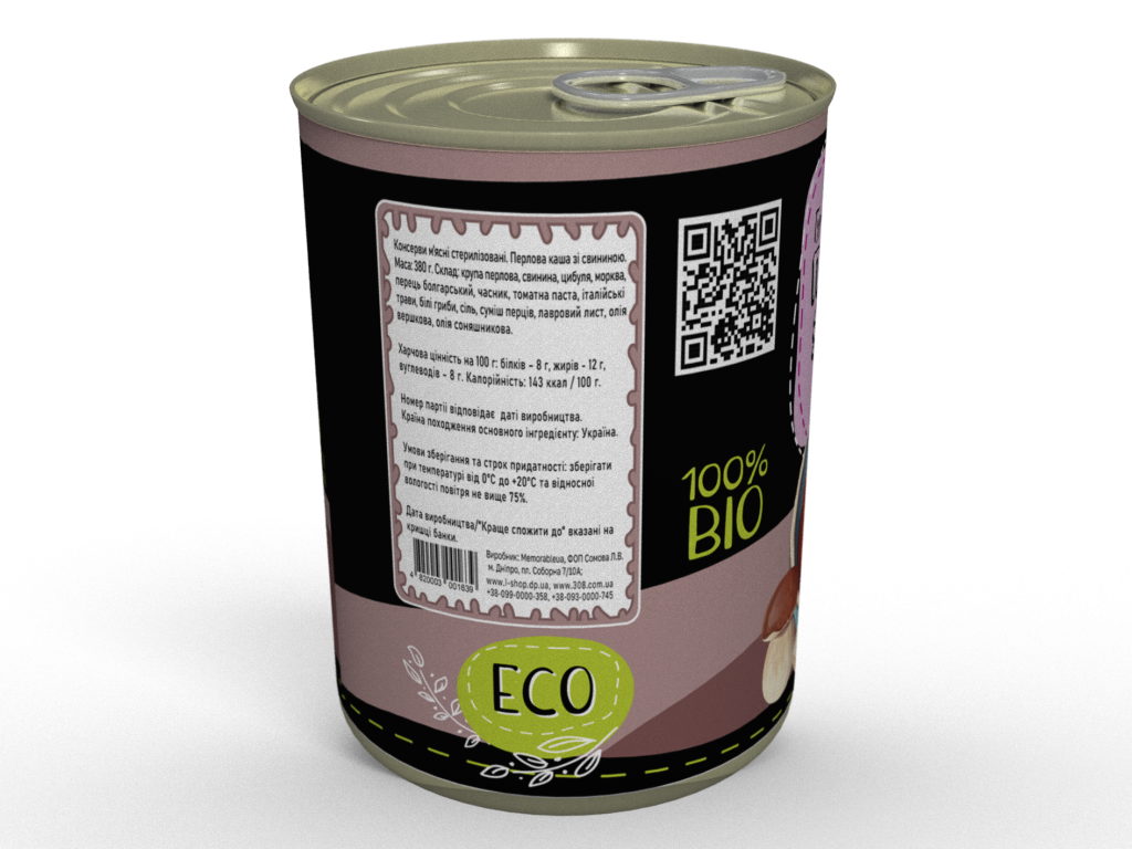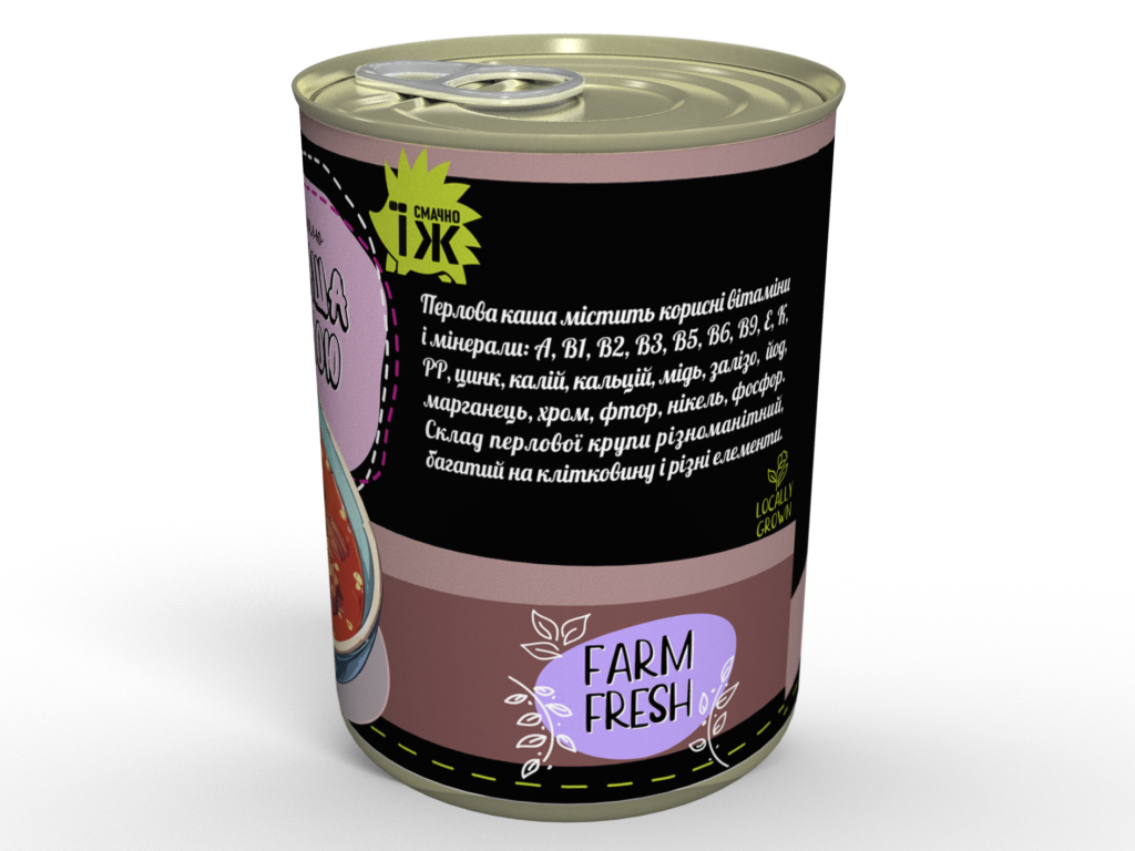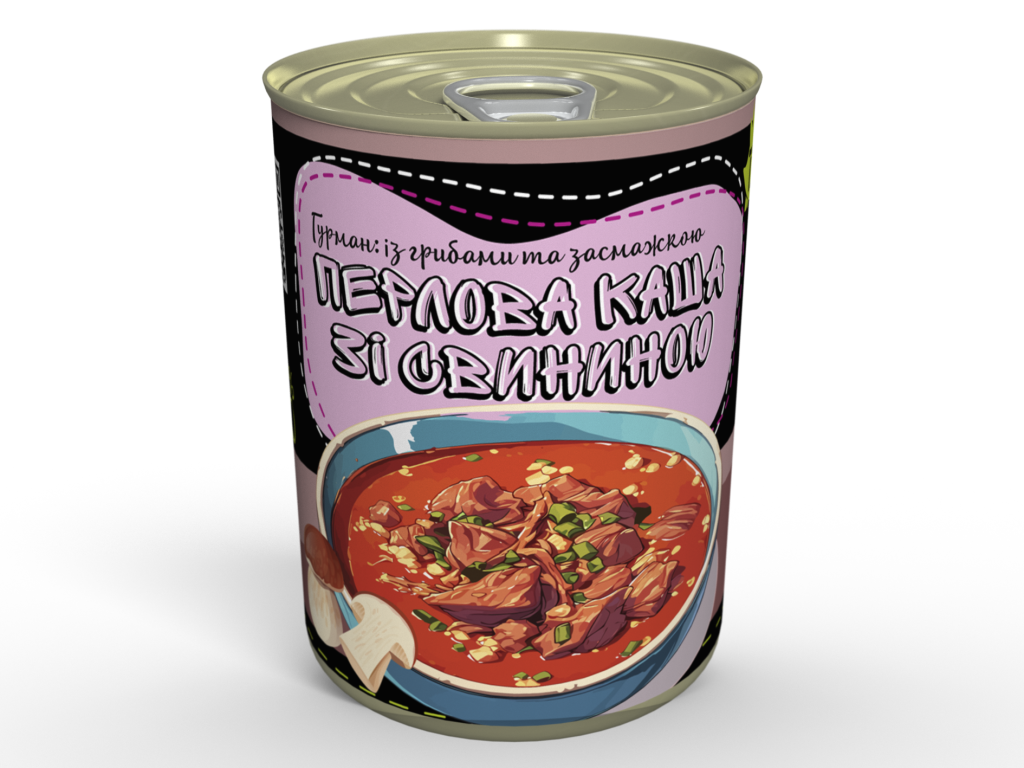 Натуральний склад: Перлова крупа, свинина, овочі (цибуля, морква, болгарський перець), білі гриби, томатна паста, вершкова та соняшникова олія, натуральні спеції.