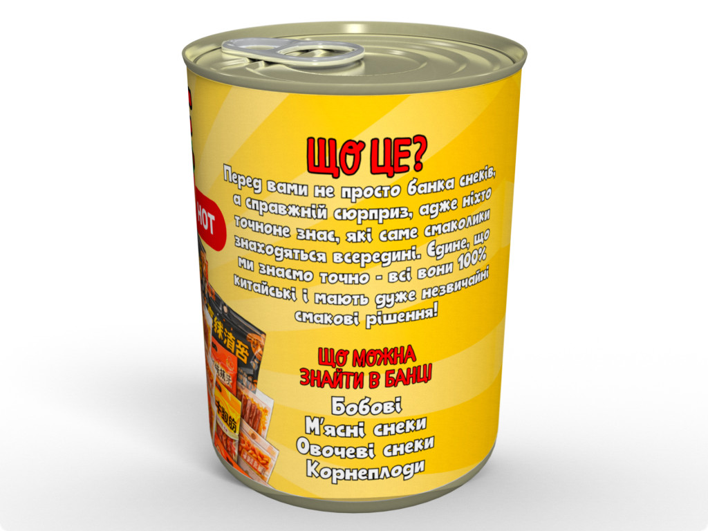 Набридли звичані чипси та горішки? Хочеться чогось новенького? Тоді скоріш замовляй цю баночку! І ній ти знайдеш справжній сюрприз - ніхто не знає, що саме попадеться тобі, але одне ми знаємо точно - всередині буде не один, а декілька пакетиків зі смаколика з Китаю. Так, вони в заводській упаковці, тобто руки українських кухарів до них не торкалися :) Така баночка з легкістю врізноманітнить будь-який похмурий вечір, адже мало хто куштував справжній Китай.