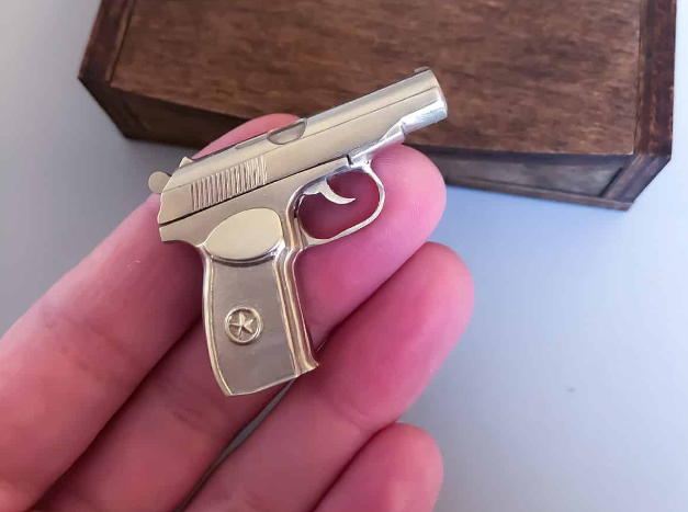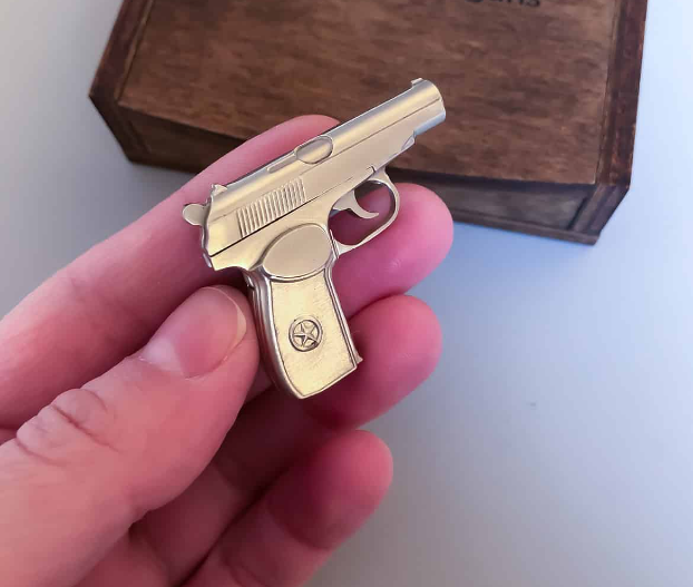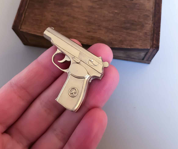 Цілком металевий мініатюрний пістолет ручної роботи. З акуратно вигравіруваним логотипом на рукоятці і частинами, що рухаються: курок зводиться і при натисканні на спусковий гачок робиться постріл.