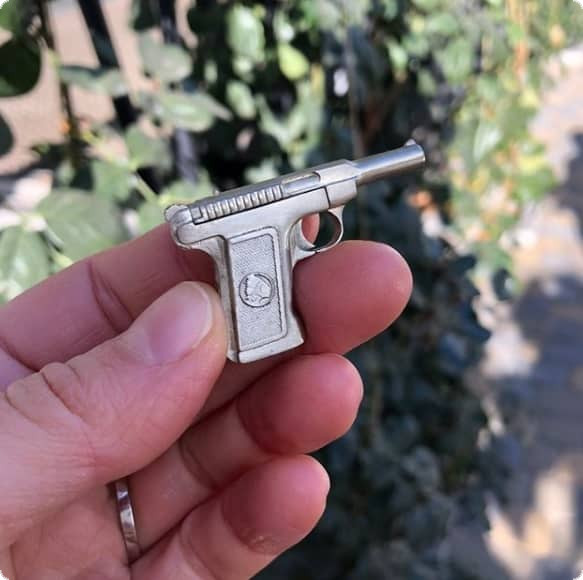 Цілком металевий мініатюрний пістолет ручної роботи. З акуратно вигравіруваним логотипом на рукоятці і частинами, що рухаються: курок зводиться і при натисканні на спусковий гачок робиться постріл.