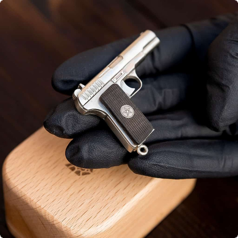 Красива деталізована мініатюра ручної роботи зі складними рукоятками, що поєднують чорне дерево та металеву емблему. Модель діє: курок зводиться і при натисканні на спусковий гачок робиться постріл.