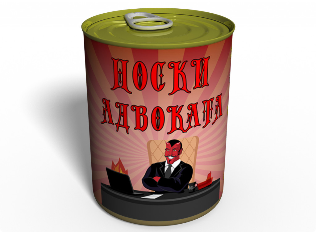 19 декабря - в этот день отмечается праздник Адвокатуры. Могли бы назвать проще - День Адвоката :) Тем не менее, такой праздник образовался 2 декабря 2002 года из-за указа президента Украины. В такой день не грех поздравить своего адвоката. И тогда встанет вопрос, а что же можно подарить адвокату: уголовный кодекс Украины в модном переплете, или... на этом все. Адвокату больше ничего не нужна, а УК у него уже есть. Мы предлагаем подойти более креативно к подарку на 19 декабря и предлагаем подарить адвокату - консервированные Носки Адвоката. Такой подарок будет с радостью принят и вызовет положительные эмоции. На картинке изображен дьявол, это как из фильма, только в данном случает это Консервированные Носки Адвоката Дьявола :)
