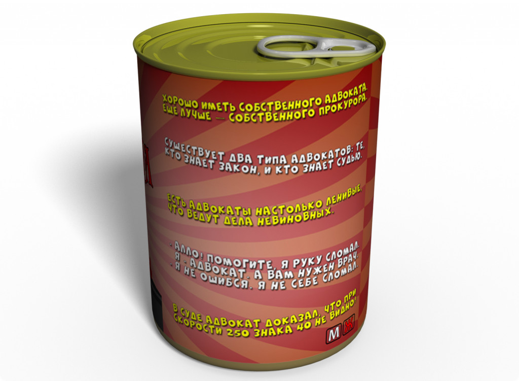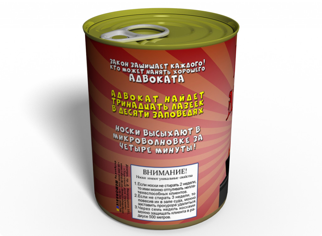 Консервированные носки адвоката - отличная идея для оригинального подарка, который вызовет удивление, ведь это действительно необычный подарок. Такой сувенир подойдет практически всем адвокатам, главное, чтобы размер ноги был от 41 до 45. А если вам нужен другой размер, то обратитесь к нашим менеджерам и сообщите какой размер нужен и мы законсервируем носки для вас.