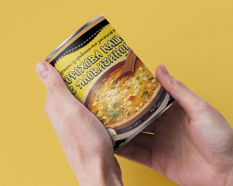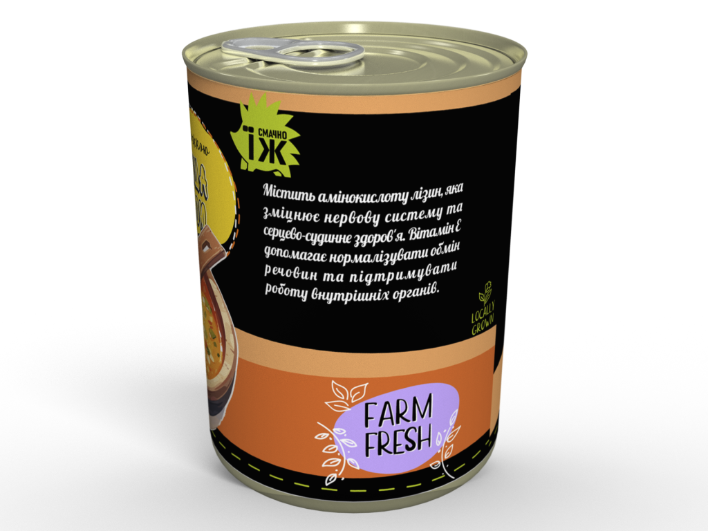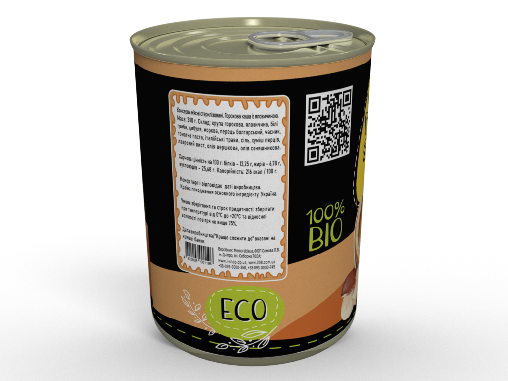 Склад: крупа горохова, яловичина, білі гриби, цибуля, морква, перець болгарський, часник, томатна паста, італійські трави, сіль, суміш перців, лавровий лист, олія вершкова, олія соняшникова.