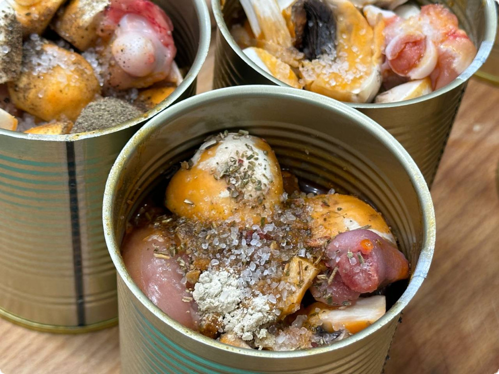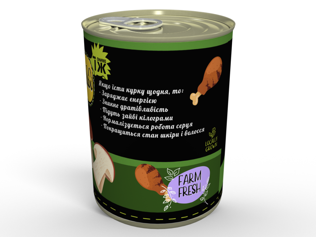 Консерви м’ясні стерилiзованi. Перзола куряча консервована. Маса: 380 г. Склад: куряча гомілка, паприка, сіль кухонна, часник, суміш перців, італійські трави, гриби.