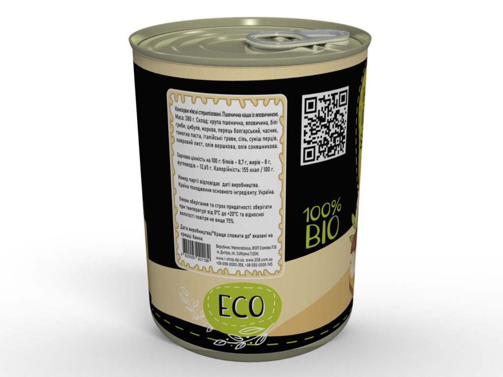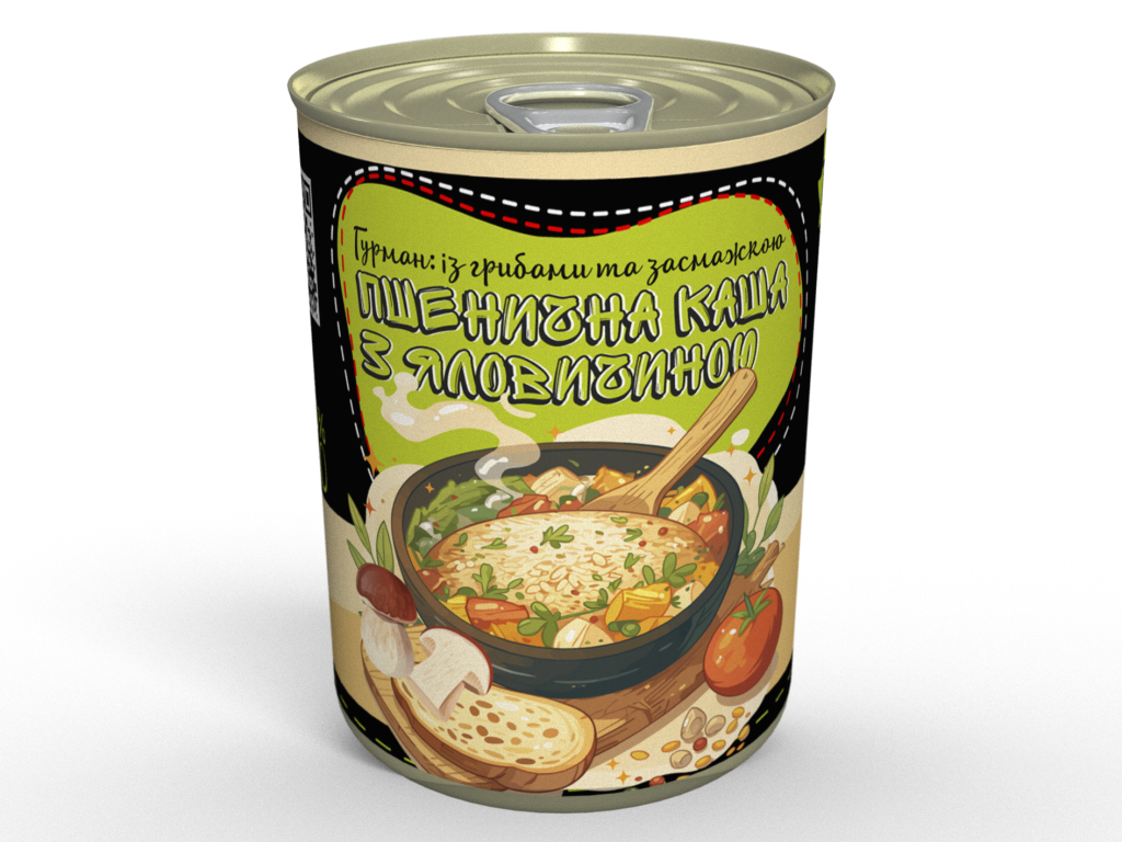 Склад: крупа пшенична, яловичина, білі гриби, цибуля, морква, перець болгарський, часник, томатна паста, італійські трави, сіль, суміш перців, лавровий лист, олія вершкова, олія соняшникова.