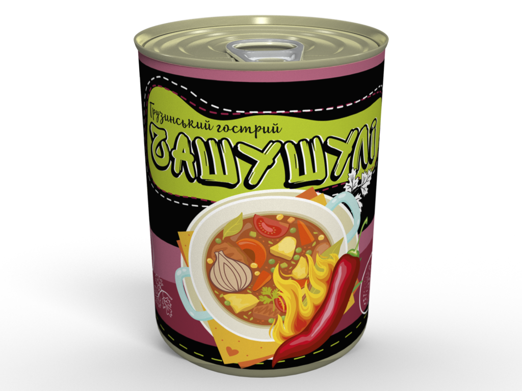Консерви овочево-м’ясні стерилiзованi. Чашушулі консервований. Маса: 380 г. Склад: перець болгарський, томати, баклажан, картопля, яловичина, червона цибуля, морква, часник, шафран, цибуля ріпчаста, хмелі сунелі, коріандр, кріп, кінза, базилік, перець Чилі.
