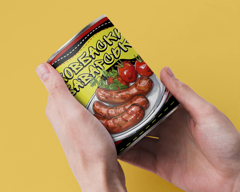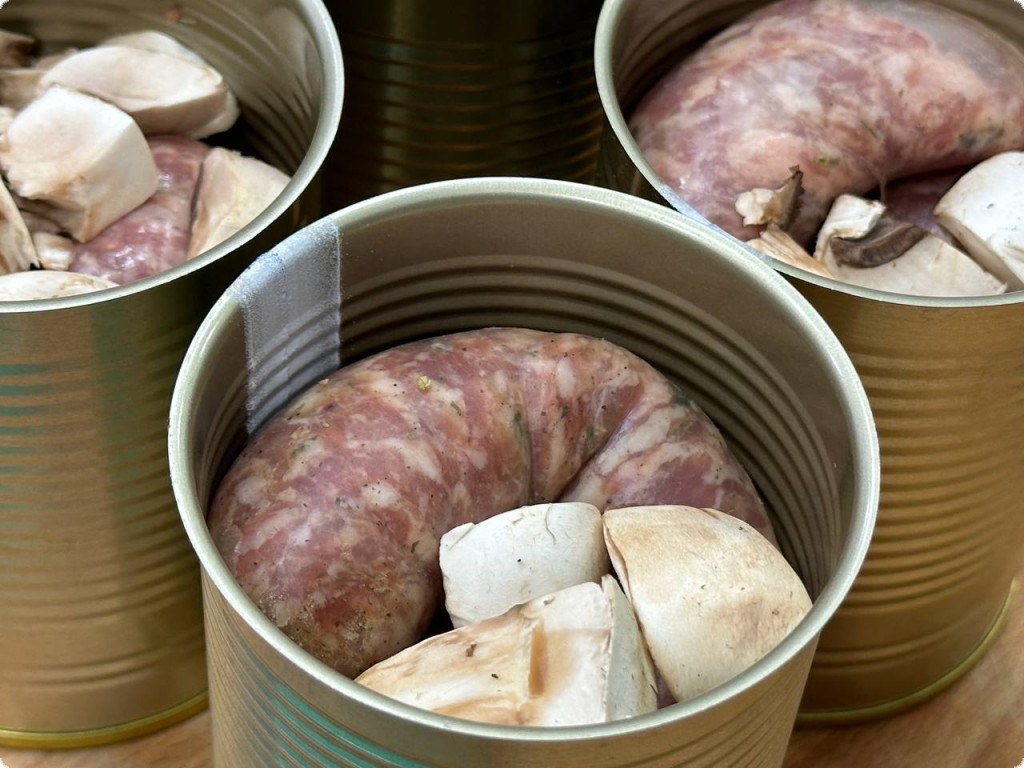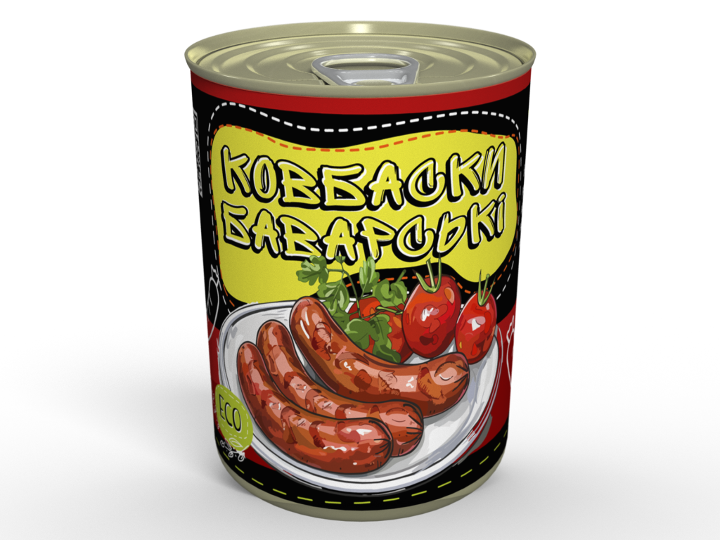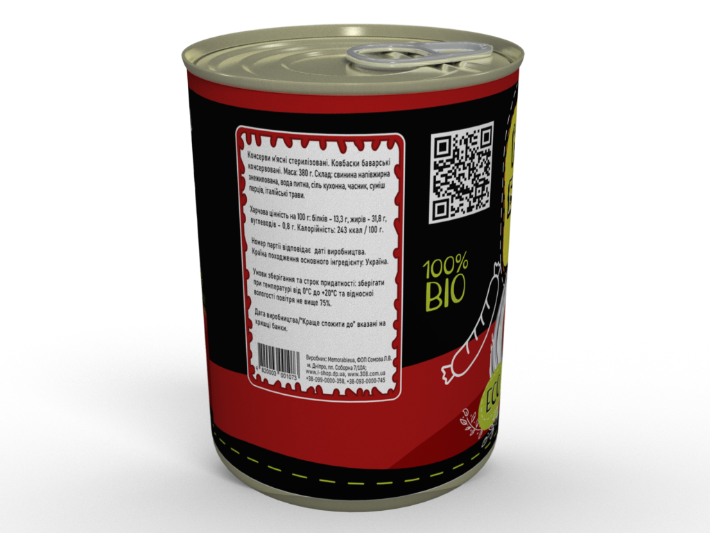 Консерви м’ясні стерилiзованi. Ковбаски баварські консервовані. Маса: 380 г. Склад: свинина напівжирна знежилована, вода питна, сіль кухонна, часник, суміш перців, італійські трави.