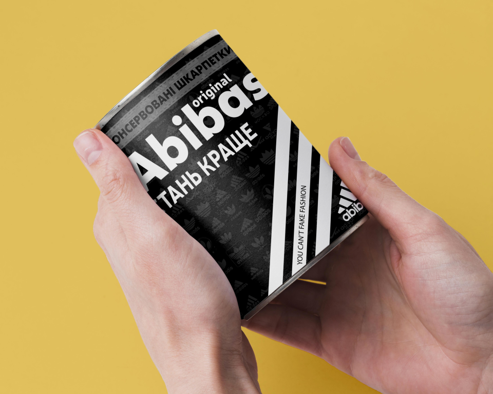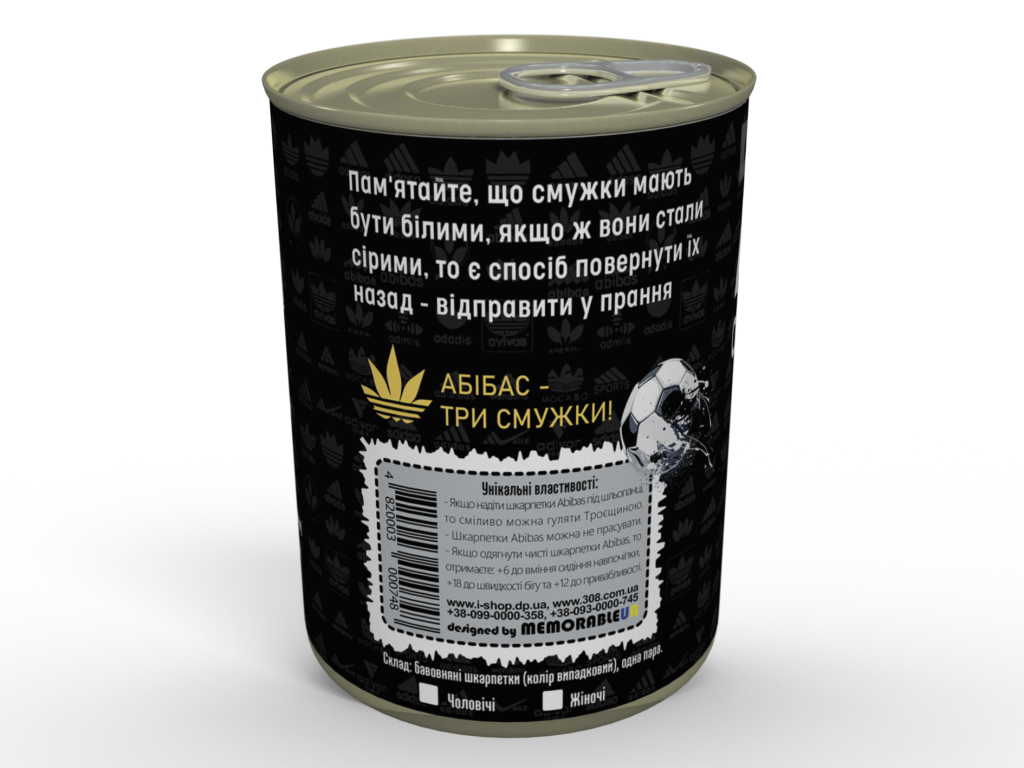 Текст на банці зі шкарпетками Abibas: