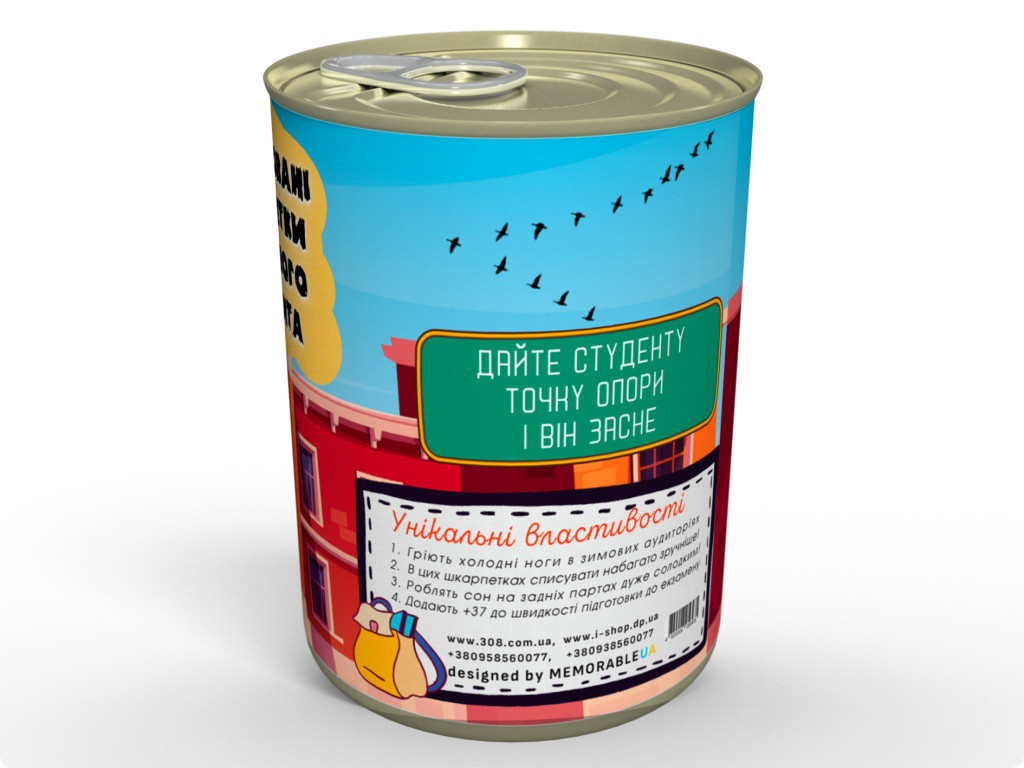 Студент - людина, яка весь час сподівається на диво та робить вигляд, що вчить конспекти. Але це також та людина, яка точно не очікує на такие подарунок, як Консервовані шкарпетки! Взагалі мало хто очікує на такий подарунок, адже це дуже несподівано та оригінально!