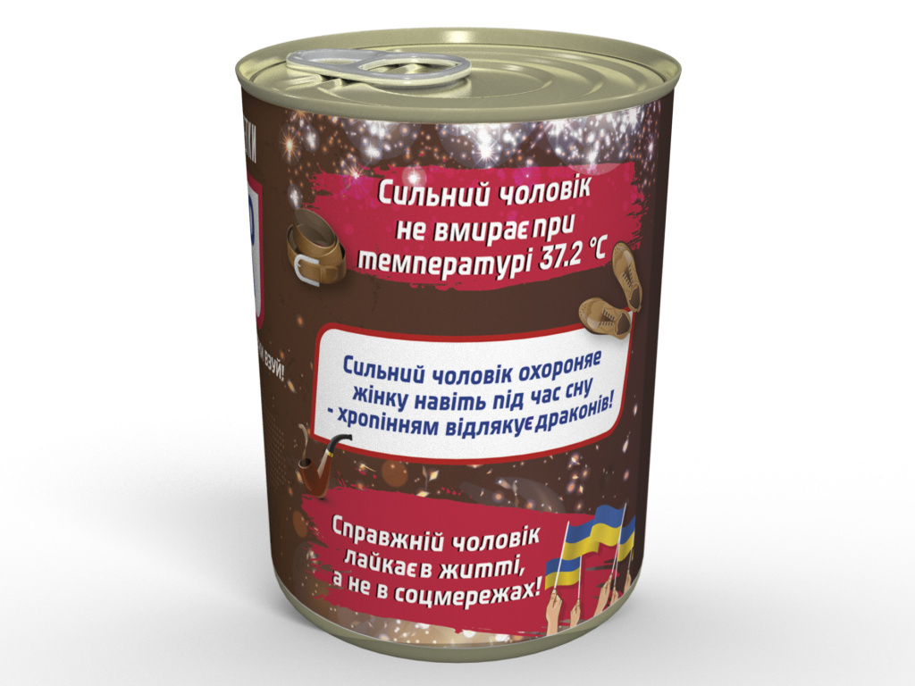 Така банка призначається для подарунка чоловікові. Це може бути як коханий, так і просто друг. Адже на банці всі тексти досить нейтральні. Усередині знаходяться якісні чоловічі шкарпетки, а також цукерка Snickers - сильний чоловік повинен добре харчуватися.