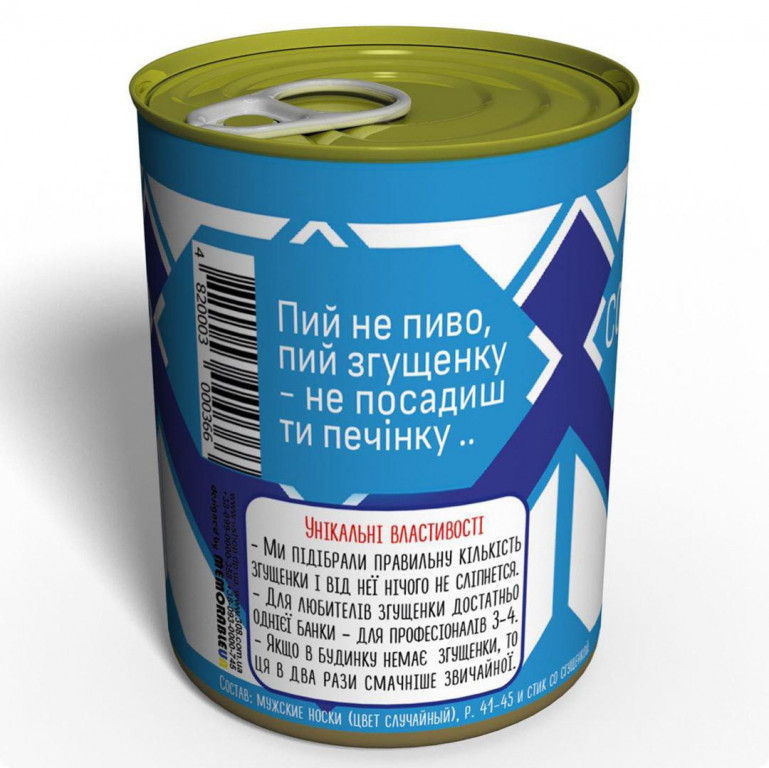 Ваш коханий і дня не може прожити без солодкого? Тоді ви прийшли за вірною адресою, адже ми пропонуємо подарунок, який можна з'їсти, і який залишиться у вас, нехай не на довгі роки, але на пару місяців точно. Консервовані шкарпетки і згущене молоко - незвичайний, смачний і корисний подарунок! Затишні шкарпетки чорного кольору і солодке згущене молоко - незабутній смак дитинства.