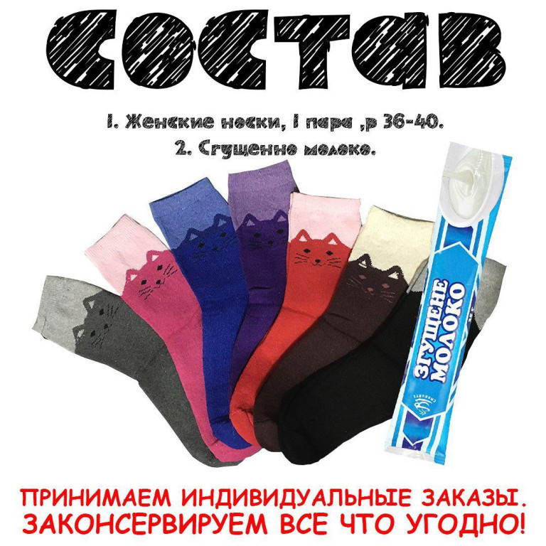 Состав: жіночі кольорові бавовняні шкарпетки, розмір 36-40 і стік зі згущеним молоком.