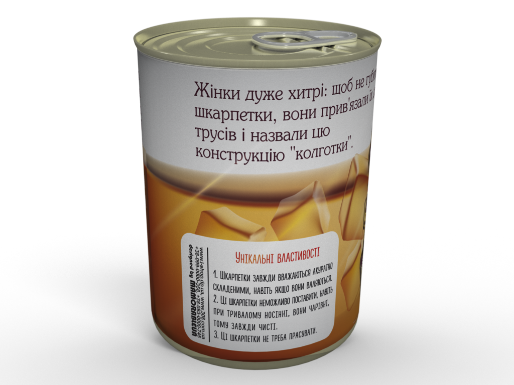Так само ми можемо зробити унікальний дизайн саме для вас. Наприклад, можна замінити нашу картинку на ваше фото. І покласти все, що завгодно в консервну банку.