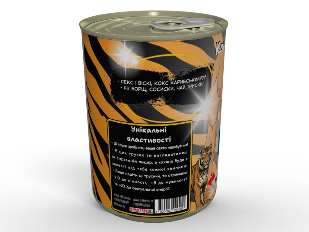 Якщо у вашому житті стало дуже мало гумору та сміху, якщо ви не знаєте, чим здивувати коханого на День Святого Валентина, то цей подарунок просто створений для вас! Ми гарантуємо веселий настрій, сміх, позитивні ємоції - адже консервовані труси вашого тигра - це саме те, чого так бажає ваш котик!