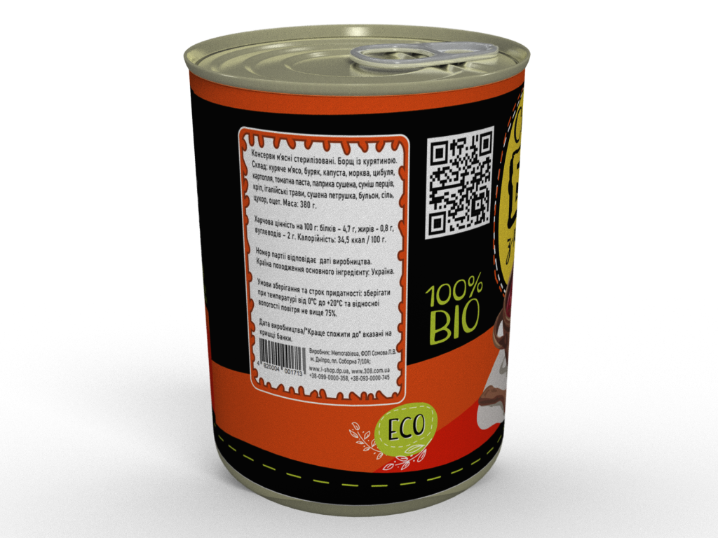 Склад: куряче м'ясо, буряк, капуста, морква, цибуля, картопля, томатна паста, паприка сушена, суміш перців, кріп, італійські трави, сушена петрушка, бульйон, сіль, цукор, оцет.