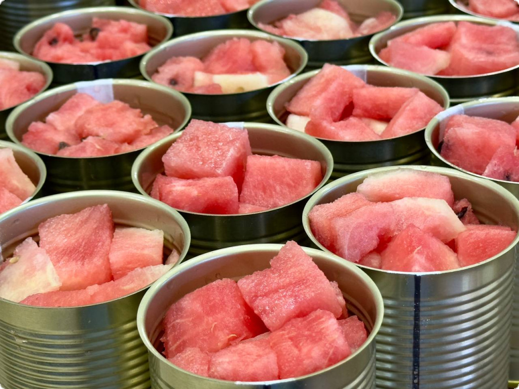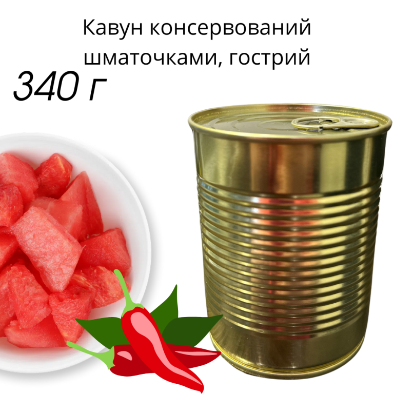 Консерви овочевi стерилiзованi. Кавун консервований. Склад: кавун шматочками (без шкiрки), цукор, сiль, вода, оцет столовий, перець Чилі.