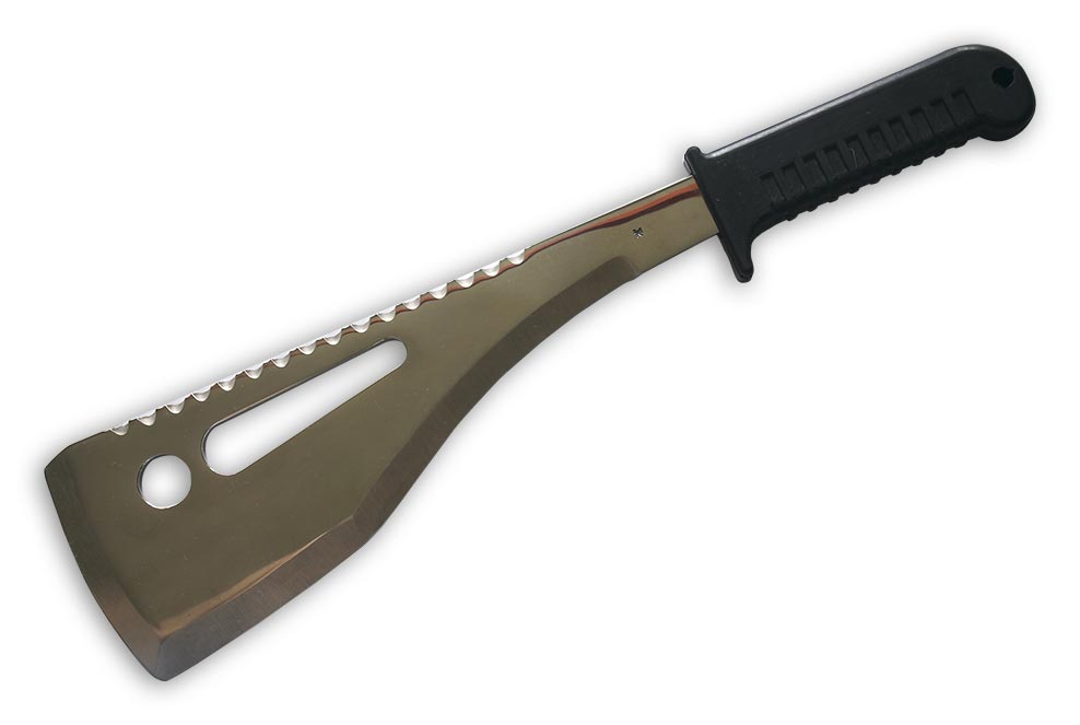 Внушительный нож с огромным клинком. Рукоять большая удобной для рубки. Небольшая гарда не дает соскользнуть руке при резах от себя. Этот нож хорош для рубки веток под колеса застрявшей машины и при обустройстве стоянки.