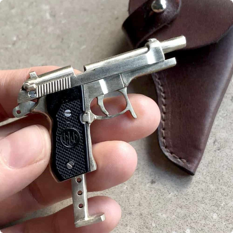 Колекційна слайдер-модель пістолета Беретта (Beretta 92FS). Цілком металевий мініатюрний пістолет ручної роботи з кастомізованими накладками, виготовленими з чорної резини, та акуратно вигравіруваним логотипом на рукоятці. Модель обладнано муляжним магазином, що виймається, та частинами, що рухаються: курок зводиться і при натисканні на спусковий гачок робиться постріл. Також модель обладнана спеціальною скобою для легкого та комфортного тиснення пальцем на курок, без залучення ніяких допоможних предметів.