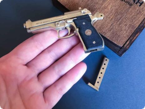 Колекційна слайдер-модель пістолета Беретта (Beretta 92FS). Металевий мініатюрний пістолет ручної роботи з кастомізованими дерев’яними накладками та акуратно вигравіруваним логотипом на рукоятці. Модель обладнано муляжним магазином, що виймається, та частинами, що рухаються: курок зводиться і при натисканні на спусковий гачок робиться постріл.