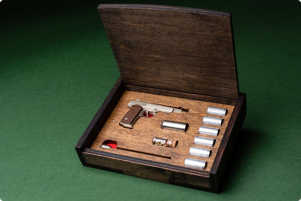 Металевий мініатюрний пістолет ручної роботи з кастомізованими накладками. З акуратно вигравіруваним логотипом на рукоятці і частинами, що рухаються: курок зводиться і при натисканні на спусковий гачок робиться постріл.