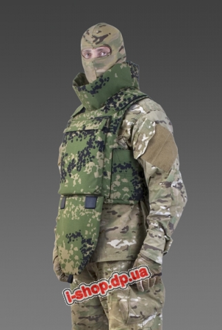 • ащита тела человека обеспечивается мягкими пакетами бронеткани (Twaron® или Dyneema®, или их смесь), расположенными спереди, сзади, на боках, в воротнике и в паховом щитке. Перед защитными пакетами переда и спины, в наружных карманах, размещаются две плиты из бронекерамики.