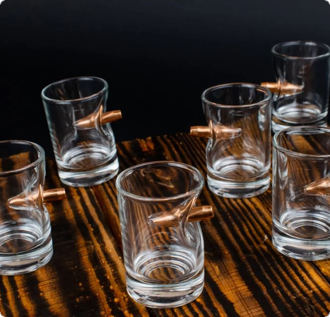 Цей презент підійде для тих, хто захоплюється стрільбою та зброєю. Ви не прогадаєте, якщо подаруєте такий набір чарок зі справжніми кулями в честь підвищення на службі поліцейського чи військового.