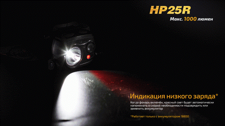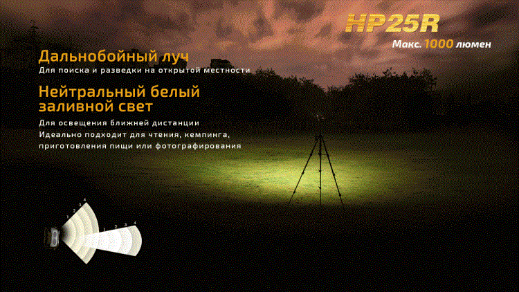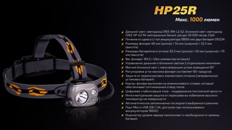 Fenix HP 25R получил сразу три светодиода, каждый из которых формирует свою группу режимов освещения. Во время движения по открытой местности будет полезен диод, который дает сфокусированный белый свет. Его луч освещает пространство на большом расстоянии и поддерживает 4 варианта яркости. Самая большая яркость составляет 1000 люмен. Затем следуют режимы на 350, 130 и 30 люмен. Дальность освещения в этих режимах колеблется от 34 до 187 метров.