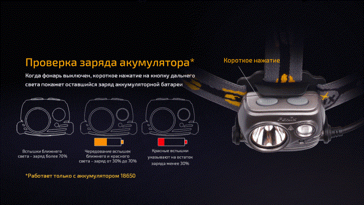 Для работы фонаря Fenix HP 25R понадобится один аккумулятор 18650 или две меньшие по размеру батарейки CR123A. В каждом случае, стоит выбирать качественные элементы питания, которые будут в состоянии обеспечить максимальную продолжительность работы фонаря. В случае, если это будет аккумулятор, его можно многократно перезаряжать, что не только экономически выгодно, но и более полезно с экологической точки зрения. Для зарядки аккумулятора подойдет как обычное зарядное устройство, которое придется покупать отдельно, так и провод USB (входит в комплект), который можно подключить к портативному источнику питания. Элемент питания устанавливается в вынесенный наружу отсек, который можно закрепить на эластичном ремешке на затылке. Внешняя часть этого блока имеет два светоотражающих элемента, за счет чего, человек с фонарем, идущий в группе, хорошо виден тем, кто шагает позади него.