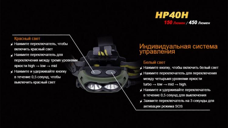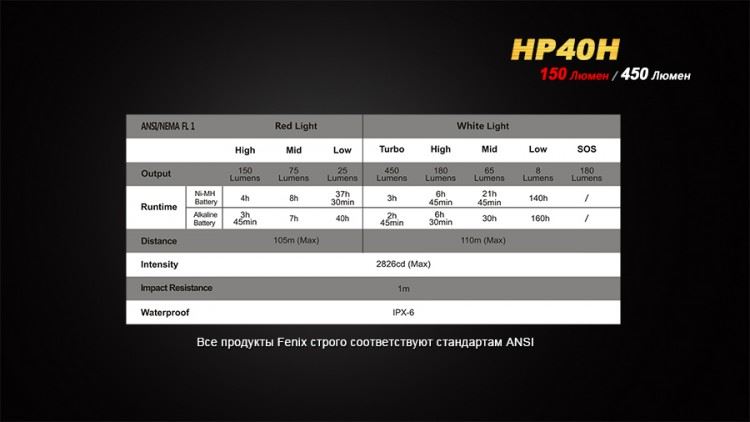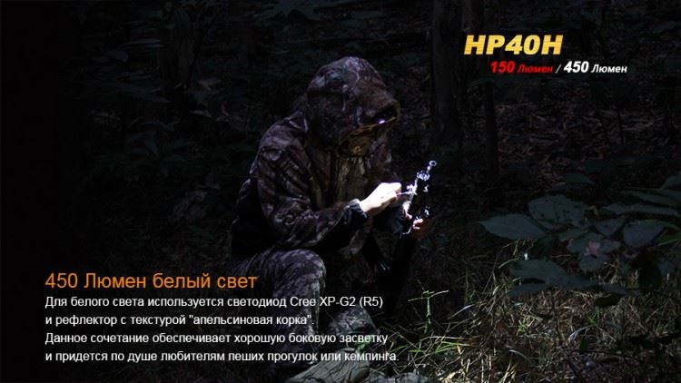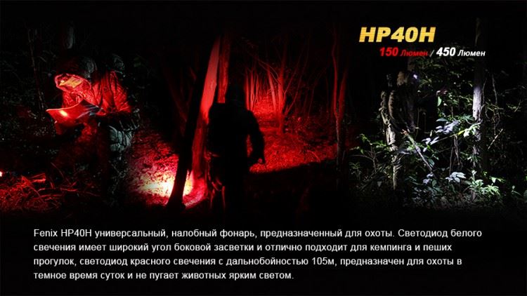 Свой налобный фонарь модели Fenix HP40H производители адресовали охотникам. В него специально интегрирован яркий красный светодиод с хорошо сфокусированным лучом света. Этот диод может предложить пользователям до 150 люмен яркости и 3 режима работы с дальностью освещения до 105 м. Известно, что красный свет не ослепляет при включении в темноте и не нарушает ночное зрение, что особенно важно охотникам. Впрочем, велосипедисты, любители отдыха на природе также могут пользоваться преимуществами освещения красным светодиодом. С его помощью проще освещать путь в тумане, рассмотреть подробности туристической карты.