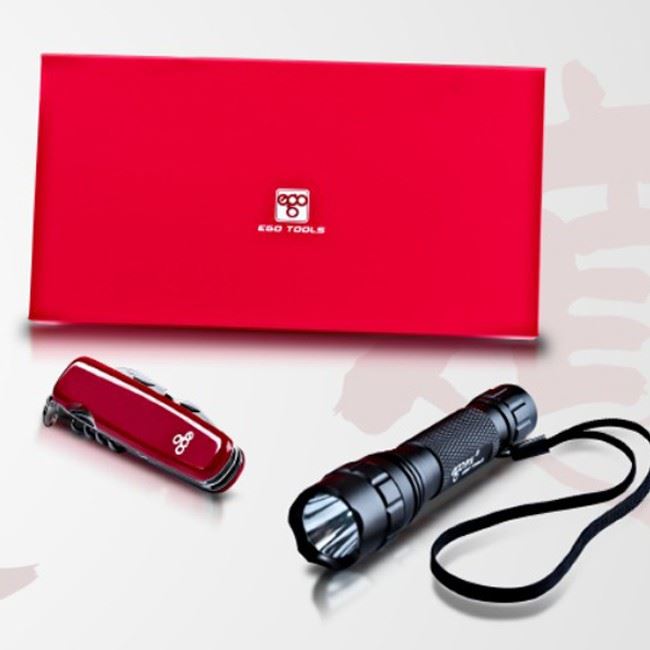 Сувенирный ансамбль AB-03 от компании EGO Tools включает в себя карманный нож-брелок и компактный, яркий светодиодный фонарик, которые в совокупности составляют прекрасный походный набор.