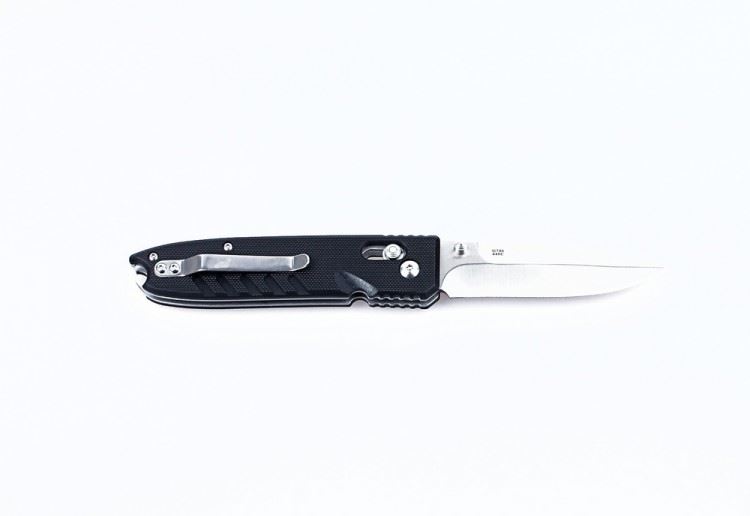 Рукоятка ножа хорошо ложится в ладонь. Ее форма очень сдержанная и аккуратная. Снизу имеется несколько небольших волн, которые защищают пальцы пользователя от проскальзывания на лезвие. Накладки на стальную основу сделаны из композитного пластика G10. С одной стороны к ним прикреплена стальная клипса.