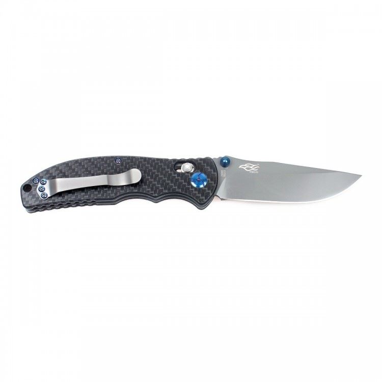 Рукоятка в модели Ganzo G7503-CF делается из композита — углеволокна. Этот материал прочнее пластика и в состоянии выдерживать нагрузки больше. Он не подвержен влиянию воды, защищен и от других разновидностей коррозии. Карбоновое волокно — легкое, что положительно сказывается и на весе всего ножа. Кстати, вес данной модели составляет 130 грамм. Металлическая деталь на рукоятке — это клипса, которая служит для крепления ножа, когда он перевозится.