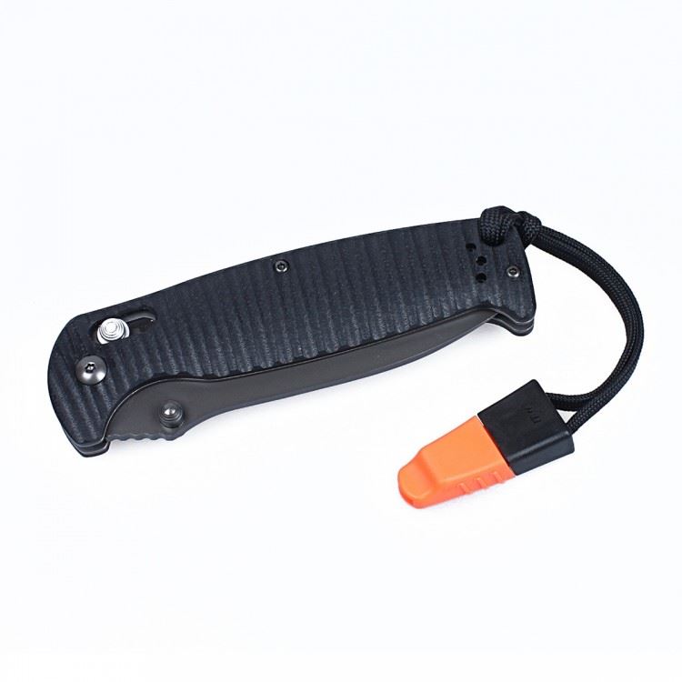 Вместе с рукояткой это значение увеличивается до 205 мм. Изготовлена рукоятка из хорошего по качеству стеклопластика. Его композитная структура делает этот материал намного более прочным, нежели используемые ранее аналоги. Накладки окрашиваются в оранжевый или черный цвет. Их поверхность — не ровная, чтобы нож не выскальзывал из рук. А дополнительно зафиксировать его в ладони поможет темляк. Дополнительный аксессуар — свисток — также крепится к темляку.