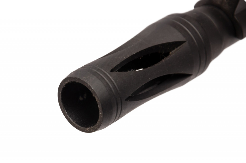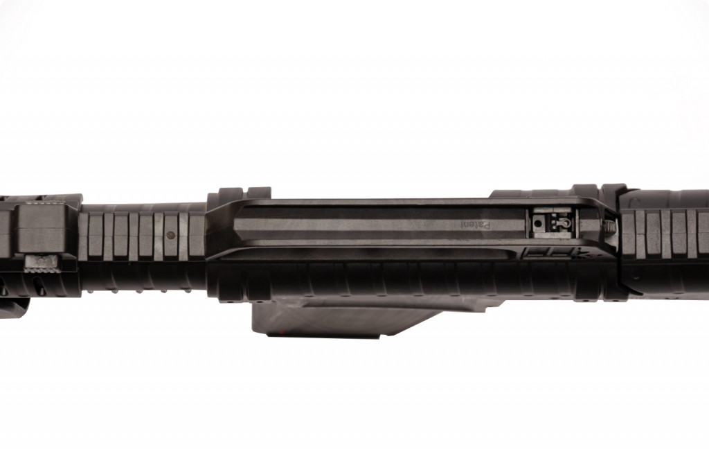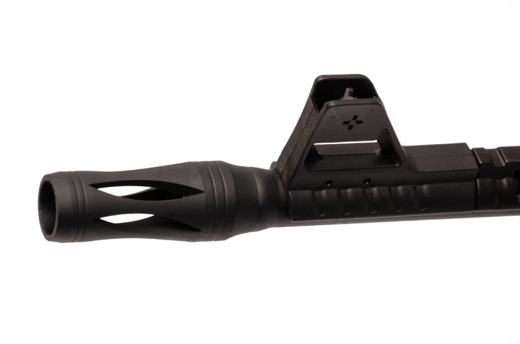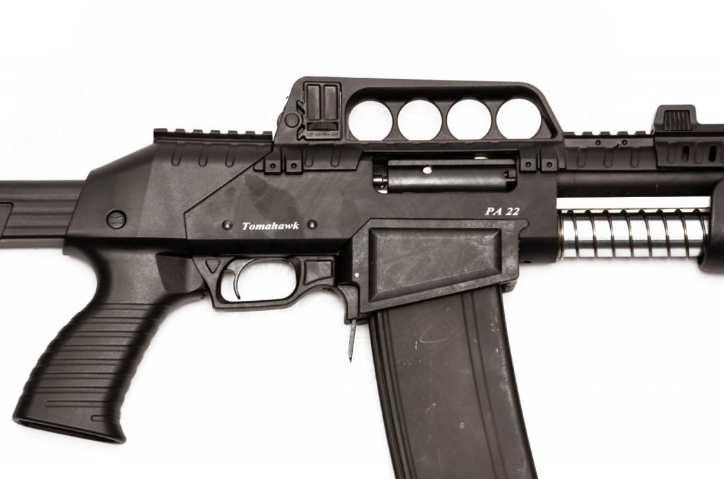 Корпус ружья Tomahawk PA-22 Tactical. Для изготовления ствольной коробки используется алюминиевый сплав 7075. А обвес изготовлен из достаточно прочного нескользящего пластика. На стволе имеется специальный металлический перфорированный кожух, который предотвращает получение случайного ожога. На конце расположен дульный тормоз компенсатор (ДТК) и достаточно большая оптоволоконная мушка обеспечивающая удобное прицеливание как солнечную погоду, так и в вечернее/утреннее время. На ствольной коробке есть крепление ласточкин хвост, а на нем уже установлена планка пикатинни на которую можно установить любой прицел (оптический, коллиматорный). Тактический приклад позволяет менять длину ружья от 96 до 106 см, а так же в него можно установить до 4 патронов. Для крепления ремня на ружье предусмотрены антабки, одна располагается на прикладе, а вторая на цевье.