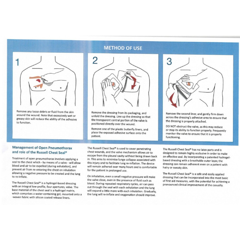 Russell Chest Seal® (RCS) – це пов’язка на основі гідрогелю з вбудованим низькопрофільним клапаном. Його призначення полягає в тому, щоб прикрити проникаючі поранення грудної клітки, щоб дозволити повітрю вийти з плевральної порожнини, не втягуючись назад. Мета полягає в мінімізації колапсу легенів, пов’язаного з цією травмою, і сприяння повторному роздуванню легень.