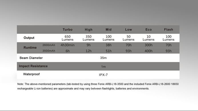 Для работы фонаря CL30R потребуются аккумуляторы размера 18650. Полный набор включает три элемента питания, но если окажется необходимым, данная модель в состоянии работать и на одном или двух аккумуляторах. В этом случае длительность работы фонаря уменьшится. Производители также привели данные о времени автономной работы CL30R при использовании фирменных аккумуляторов на 2600 мАч и на 3500 мАч. Для режима Turbo это 4 с половиной и 6 часов, для режима High — 9 и 12 часов, для режима Mid — 38 и 51 час, для режимов Low и Flash — 70 и 93 часа, для режима Eco — 300 и 400 часов. Таким образом, емкость и качество элементов питания напрямую влияет на период автономной работы кемпингового фонаря.