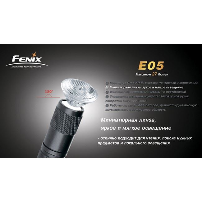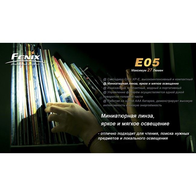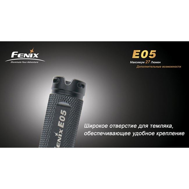 Фонарь Fenix E05 самый компактный среди фонарей-брелков. Как и все фонари бренда Fenix, Е05 - водонепроницаемый, противоударный фонарик с анодированием высшей степени. Имеет максимальную яркость 27 люменов. Максимальное время непрерывной работы - около 3 часов.