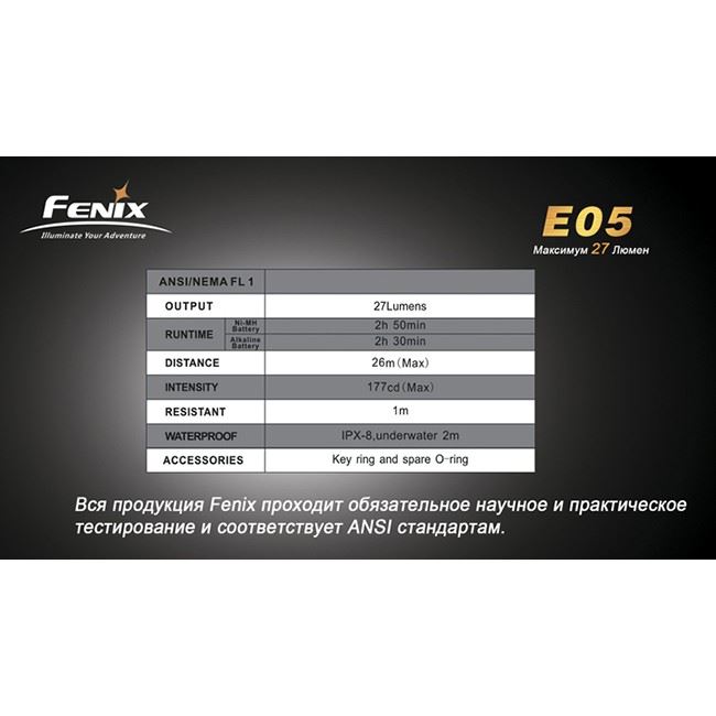 Кроме того, E05 соответствует стандарту водонепроницаемости IPX-8 (до 2 метров). Благодаря надежности и прочности корпуса, фонарик не боится повреждений. Fenix E05 - идеален в качестве брелочного фонаря на каждый день.