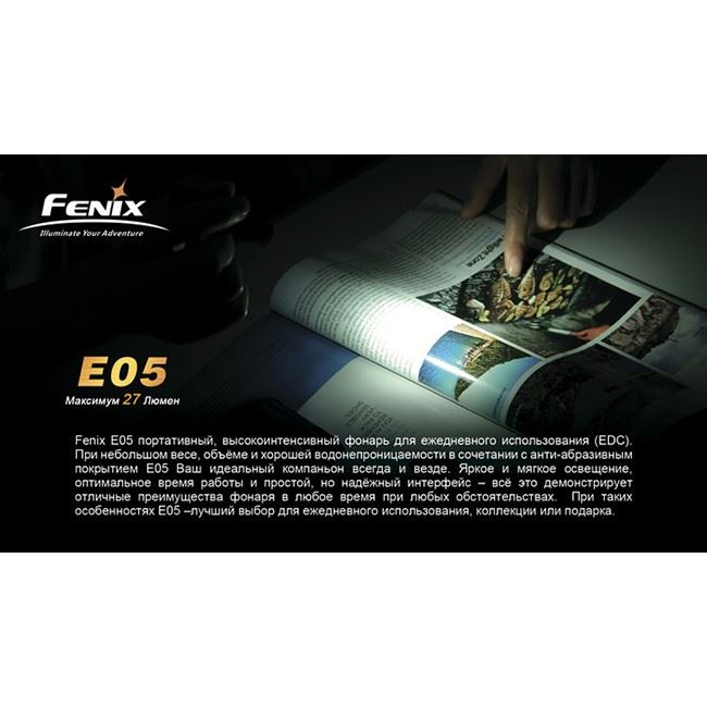 Фонарь Fenix E05 самый компактный среди фонарей-брелков. Как и все фонари бренда Fenix, Е05 - водонепроницаемый, противоударный фонарик с анодированием высшей степени. Имеет максимальную яркость 27 люменов. Максимальное время непрерывной работы - около 3 часов.