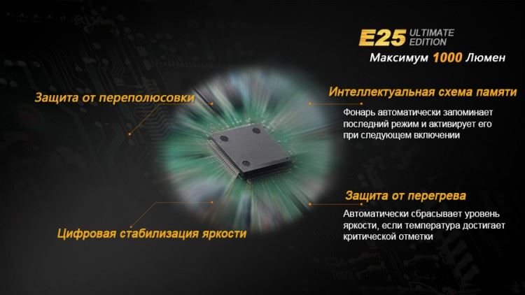 Залогом универсальности фонаря Fenix E25UE стало то, что для него производители использовали наиболее современные комплектующие и задействовали не только традиционные для бренда, но и новые технологии. Яркость луча на уровне 1000 люмен обеспечивает один из самых надежных светодиодов Cree XP-L V5. Заявленный для него срок работы — не меньше 50 000 ч. Также используется цифровой драйвер для стабилизации яркости в каждом из режимов и защита фонаря от перегревания в режимах большой яркости. Энергию, необходимую для поддержания работы фонаря, обеспечивают два элемента питания популярного пальчикового формата. Пользователи могут выбирать между несколькими вариантами: щелочными (алкалайновыми) батарейками Li-ion или Ni-MH аккумуляторами. Вот только режим Turbo будет доступным только с литий-ионными аккумуляторами. Эти же элементы питания обеспечат яркость в 1000 люмен для стробоскопа. Яркость и длительность работы фонаря производители протестировали со всеми возможными вариантами элементов питания. Во время тестов использовались исключительно качественные батарейки, а также фирменные аккумуляторы: Fenix ARB-L14-800 (формат 14500) и Fenix 2500 мАч Ni-MH.