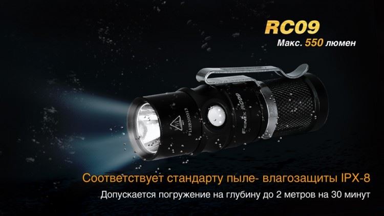 Клипсу для закрепления фонаря на лямке рюкзака или в кармане одежды можно присоединить к корпусу в двух различных положениях. Как и корпусы большинства других фонарей Fenix, в модели RC09 он полностью водонепроницаемый. Эта характеристика соответствует принятой на международном уровне системе стандартов ANSI по классу IPX-8.