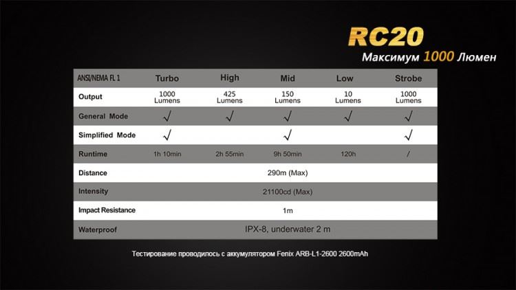 К услугам владельца фонаря Fenix RC20 4 ступени яркости: Turbo (1000 люмен), High (425 люмен), Mid (150 люмен), Low (10 люмен). При этом срок работы без подзарядки на базе аккумулятора Fenix ARB-L1, накапливающего 2600 мАч заряда колеблется в пределах 1 ч 10 мин — 120 ч. Производители также отмечают возможность покупки более емких аккумуляторов Fenix, совместимых с этим фонарем.