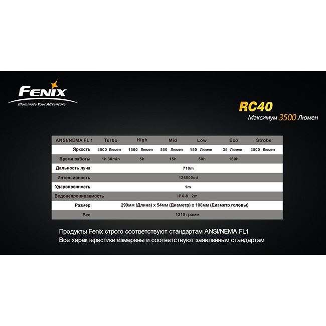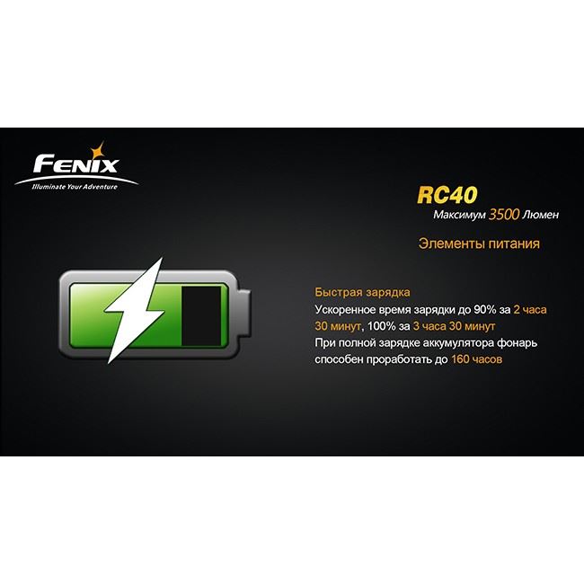 Fenix RC40 – самый мощный среди фонарей Fenix, при этом фонарь имеет компактный размер и удобство в управлении. Фонарь работает на фирменном аккумуляторе Fenix 7800mAh / 7.4V. Выносливый фонарь может непрерывно работать - 160 часов.